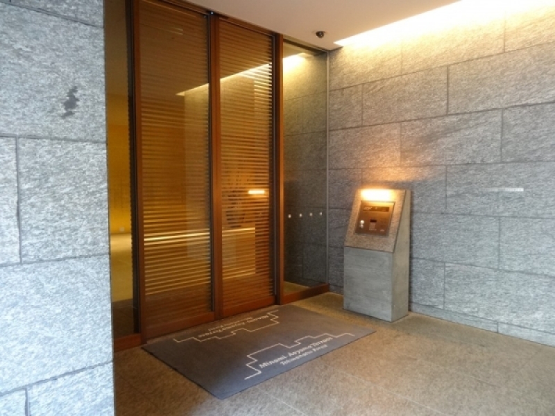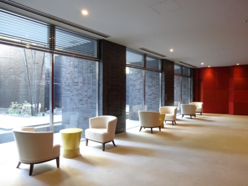 グレーの燻しレンガタイル張りで重厚感のある外観。高級ホテルを思わせるエントランスロビーでは24時間有人管理でフロントサービスを提供。