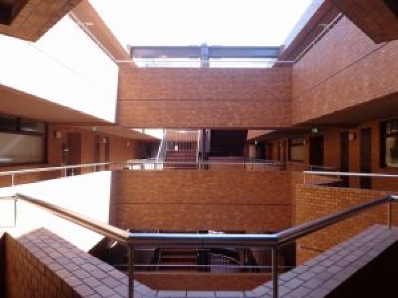 重厚感のあるタイル貼りの外壁で、傾斜した屋根が特徴的。エントランスに入ると、中央にある吹き抜けから光が差し込みます。各住戸は吹き抜けを囲うように、口の字型に配置されています。