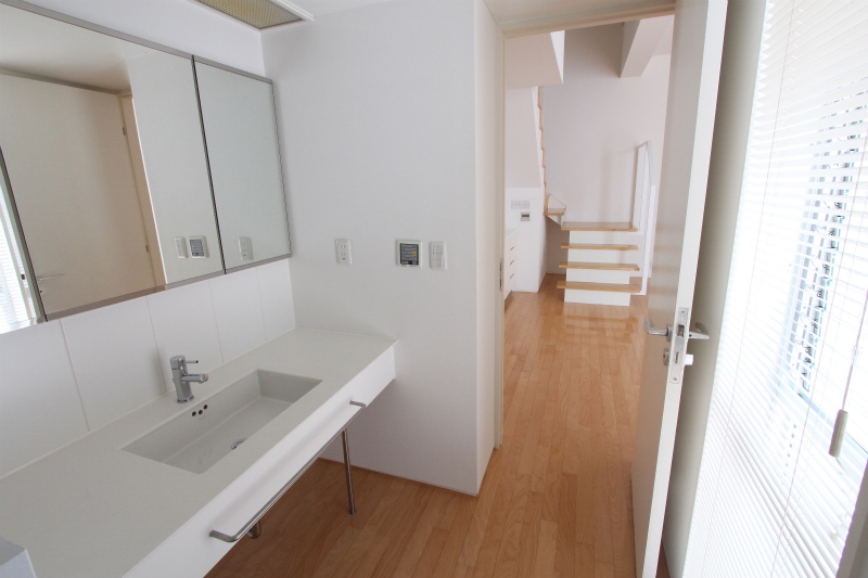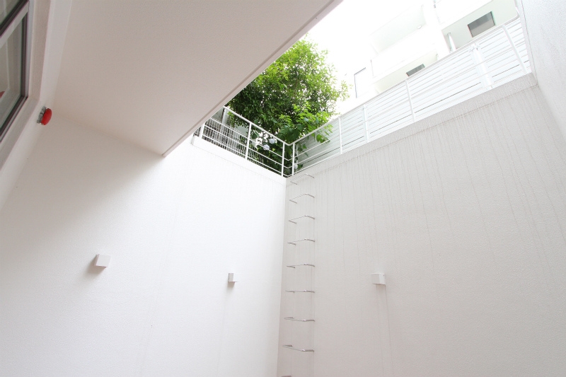 シンメトリーのファサードとガラスウォールと白を基調としたデザイン性の高い外観が存在感を放つ外観。室内は白と木目を基調とした明るくナチュラルな印象。広く取られたドライエリアは光と共に開放感を与えます。