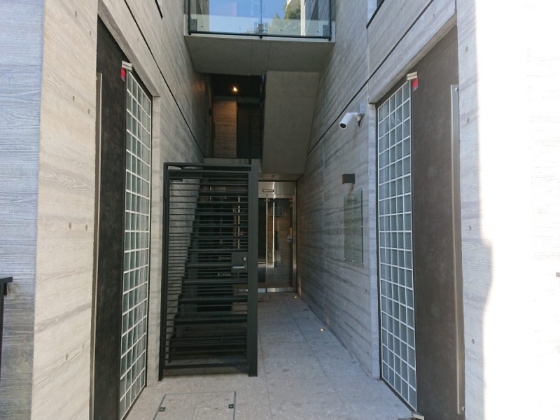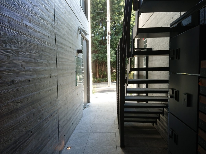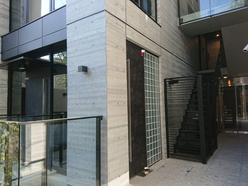 グレーベースのタイルとガラスウォールがスタイリッシュな外観は、シャープなビジネスパーソンにぴったりな外観。