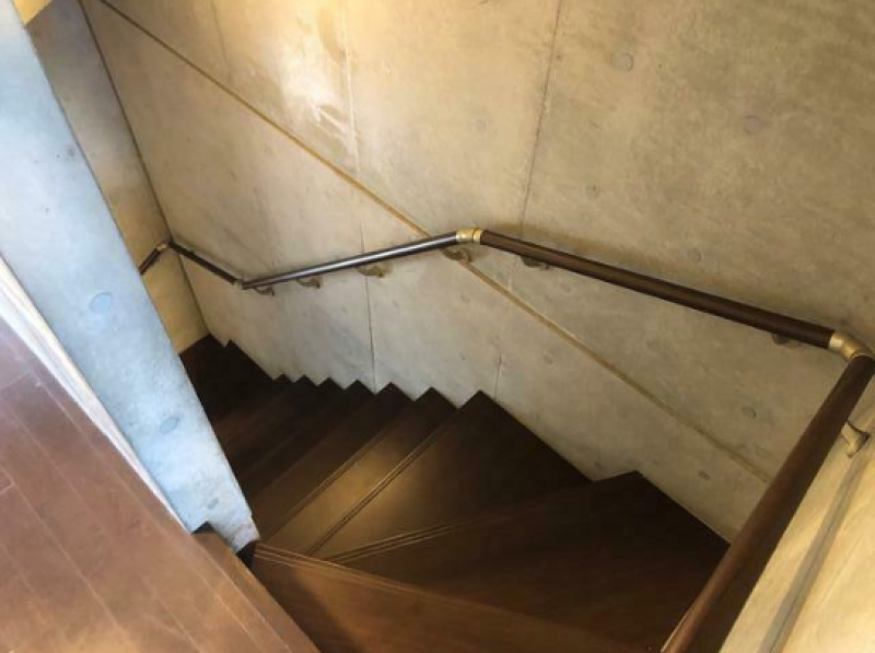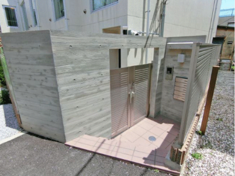 段々と重なる白い壁と大きく取られたガラス窓が印象的な建物。グレーの木目調のエントランスがスタイリッシュさを演出します。