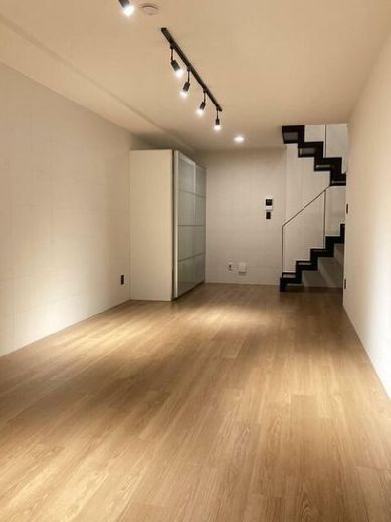 室内は白を基調とし、ダークウッドがアクセントとして全体を引き締めるスタイリッシュなデザイン。地下を含むメゾネットタイプの設計で、一部に使われた打ちっ放しの天井や、レールライトの間接照明が、都会の秘密基地のような空間を演出します。