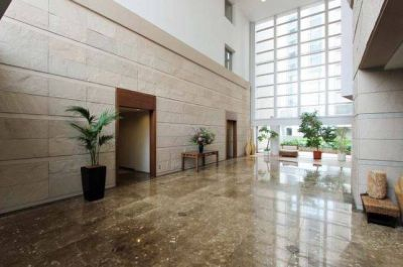 重厚感のある石造りの外壁や噴水のある石張りの共用部が一際目を引く外観。10メートル超の高さを確保した開放感のあるエントランスロビーは大理石調のタイル張りで、観葉植物やソファもセンスが良く、フロントコンシェルジュも常駐しておりリゾートホテルの様です。