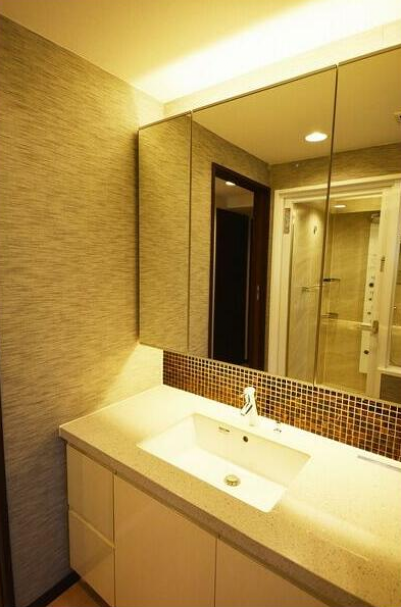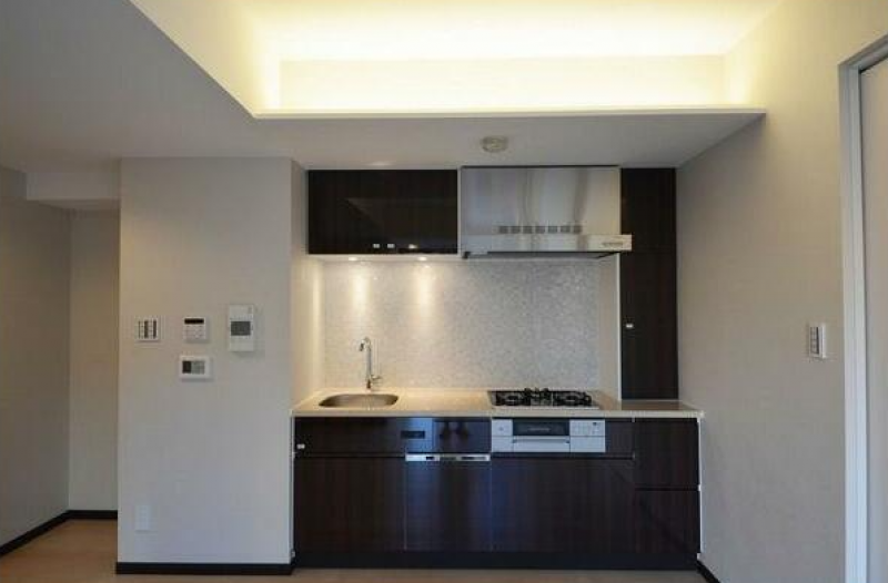 白を基調とした室内は、間接照明が効果的に部屋を優しい灯りで満たした、明るく開放的な空間。ダークウッドがアクセントとなり、部屋全体を引き締めながらも落ち着きを与えます。