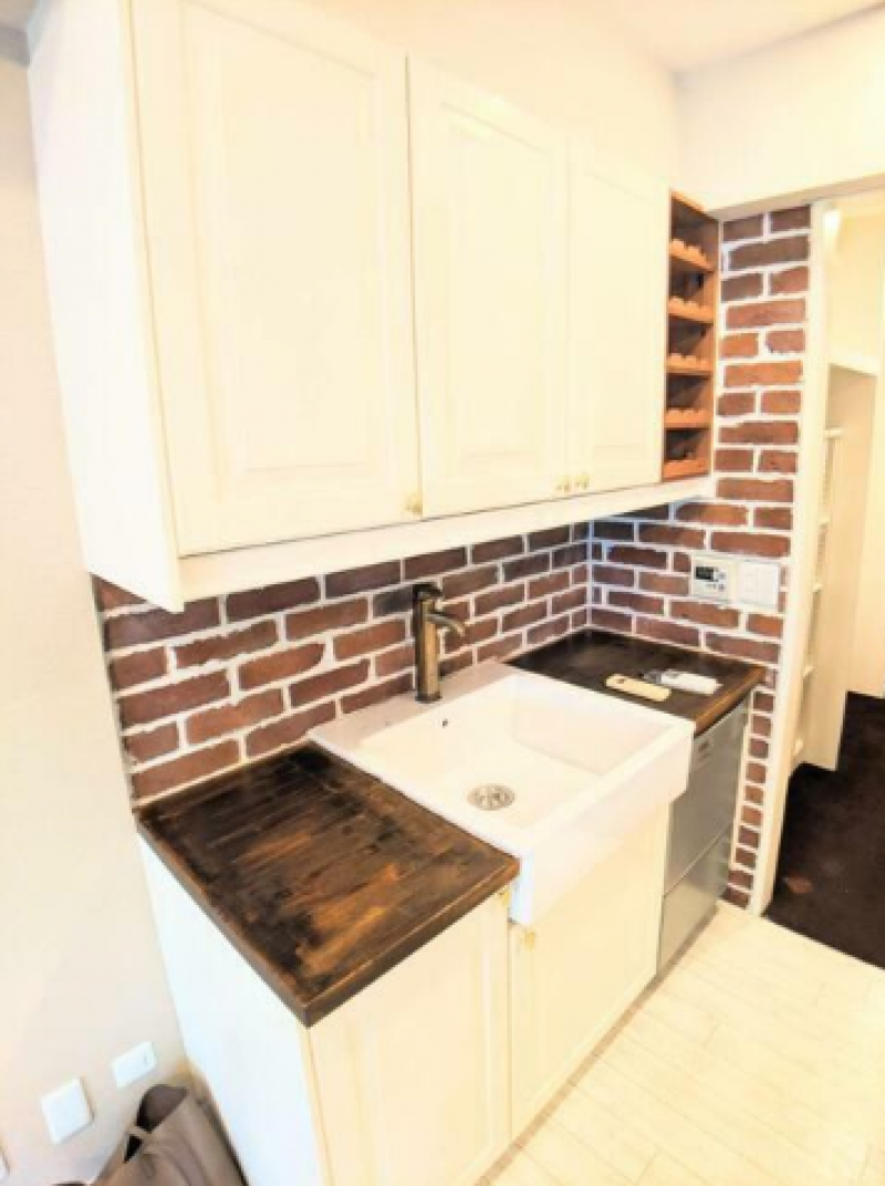 室内は白を基調とし、ダークウッドがアクセントとなる温かみのある空間。窓から注ぐ陽光とレールライトなどの間接照明が部屋を優しく灯します。また、キッチンに用いられたレンガ調のデザインが、レトロでカントリー風な雰囲気を演出し、都会の中心にいることを忘れてしまうくらいの居心地の良さを与えてくれます。