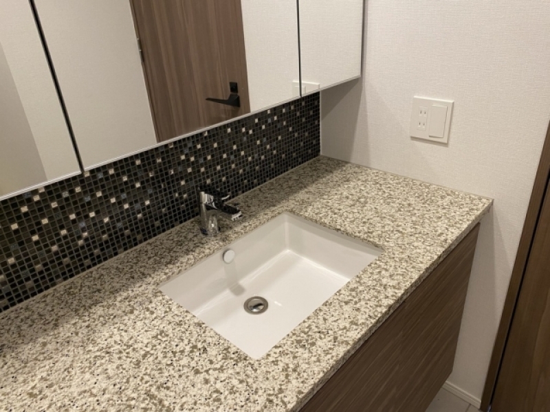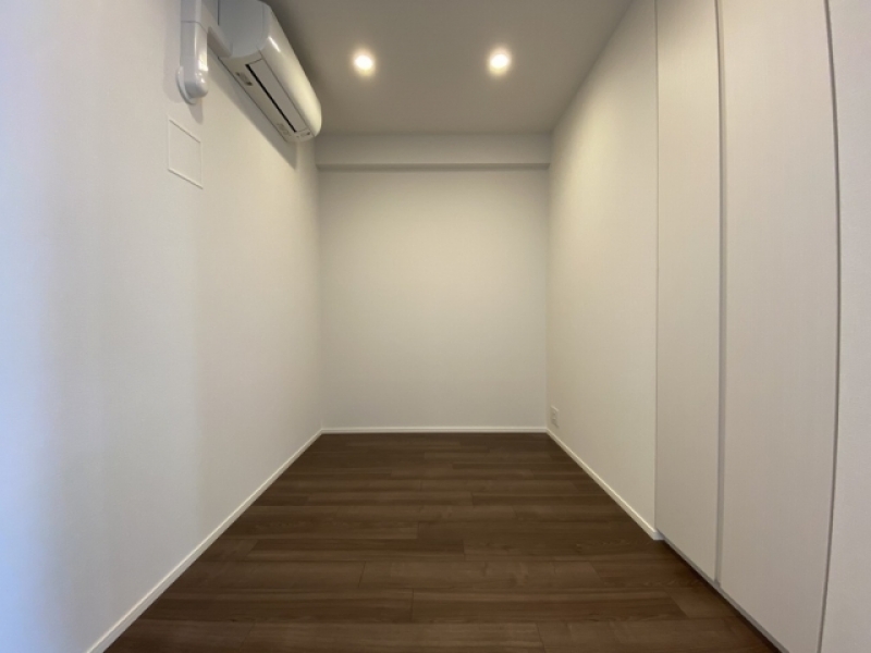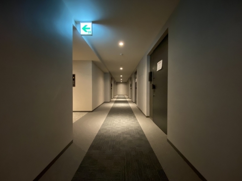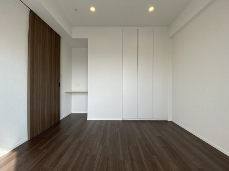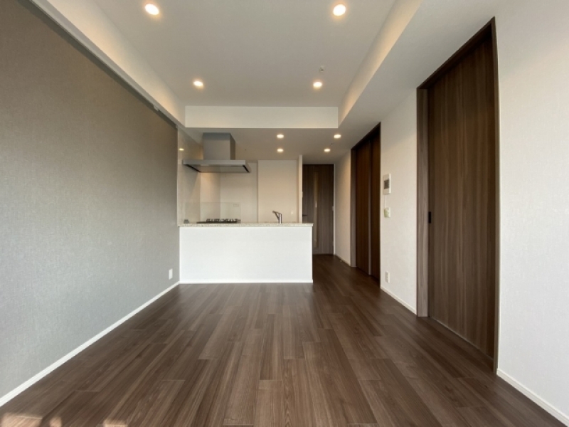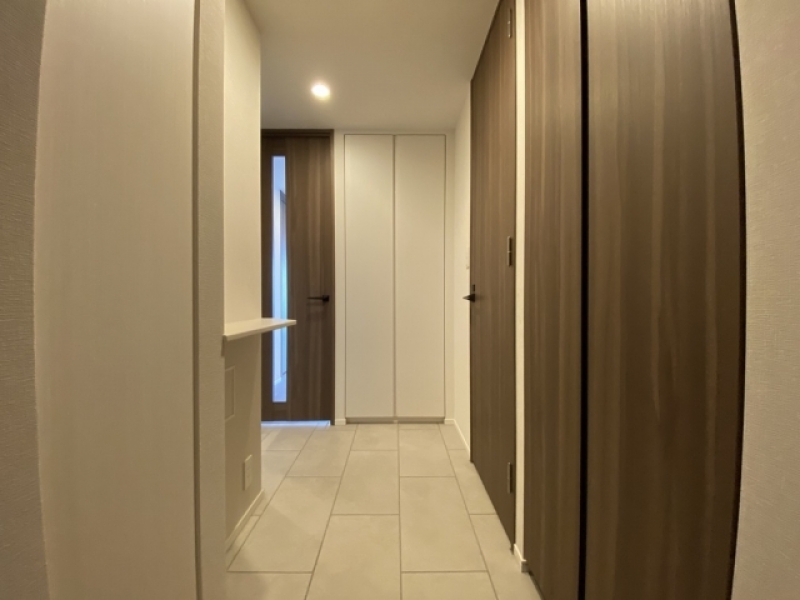 プライバシーにも配慮された内廊下を進ンダサきに広がる室内は、白をベースとした上品な空間。アクセントとなるダークウッドや間接照明の明かりが、部屋全体にぬくもりと落ち着きを与えてくれます。