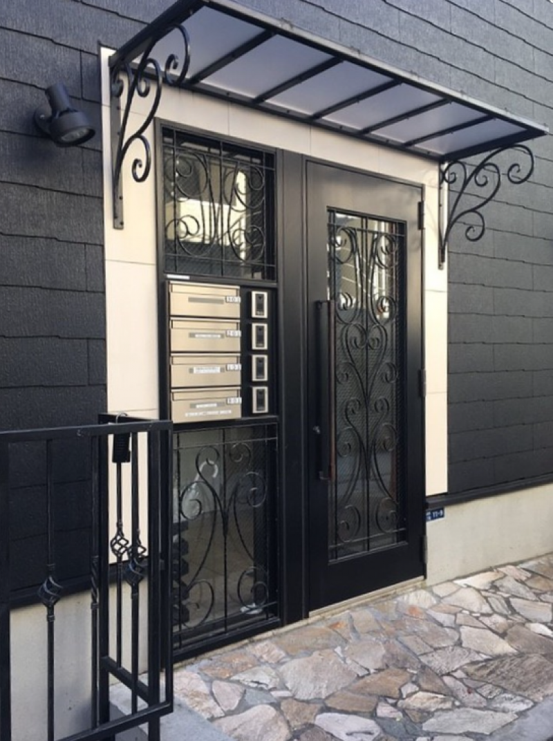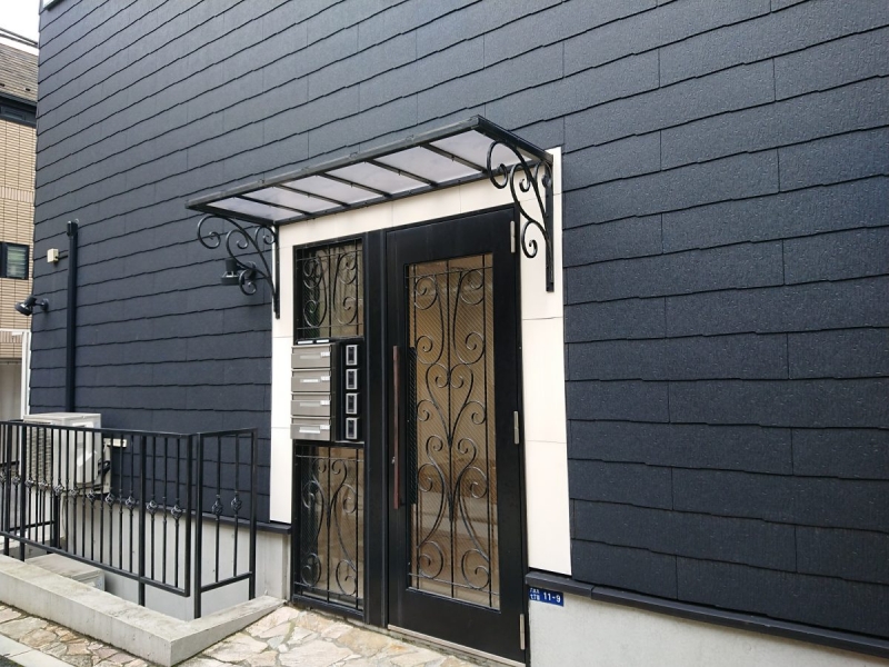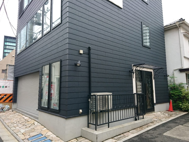 ダークグレーの外壁と黒で統一された窓枠やアイアンワークの手摺のデザインがスタイリッシュで人目を引くデザイン。