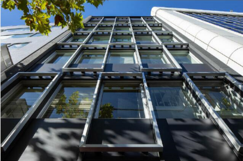 リノベーションされた、グレーの外壁とガラスウォールが幾何学的に組み合わされた外観は経年を感じさせないスタイリッシュなデザイン。