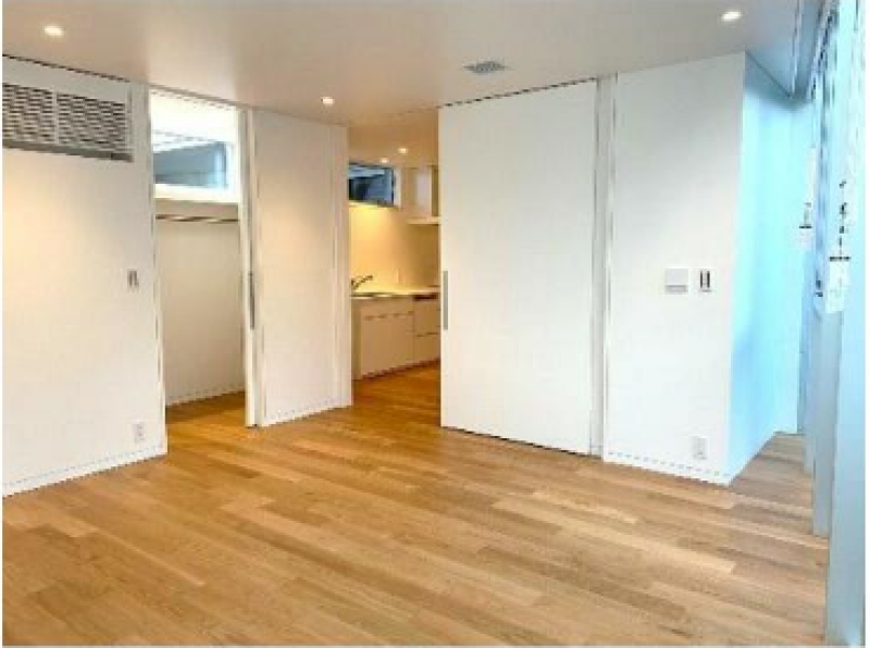 エントランス横の専有階段を上った先の室内は、3面採光の光溢れる空間。リビングスペースに続く洋間は全面ガラス張りとなっており、都会ならではのクールさを感じます。