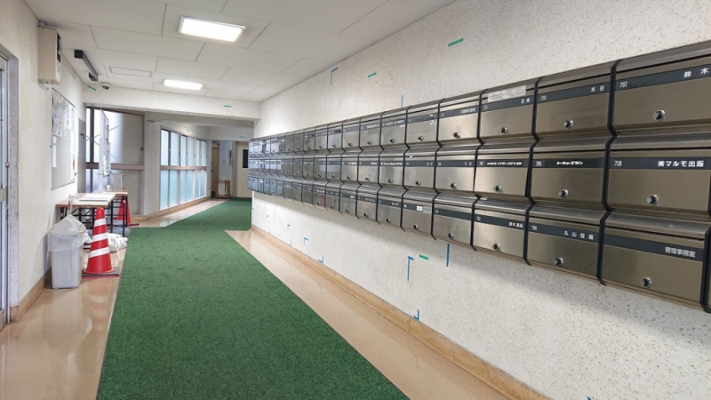 アイボリーの外壁のレトロ感溢れる建物。共用部のグリーンカーペットなど、そこかしこに誰もの心の片隅にあるノスタルジーをくすぐる空間が広がります。