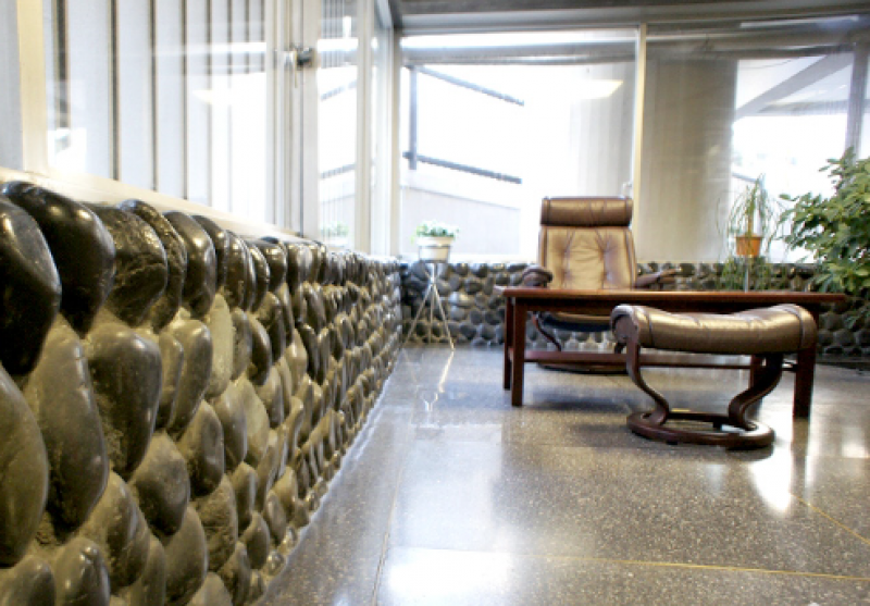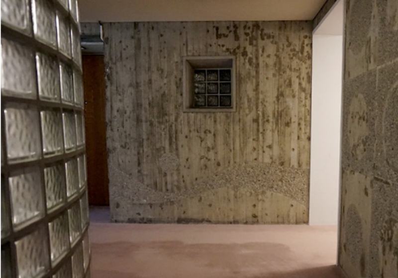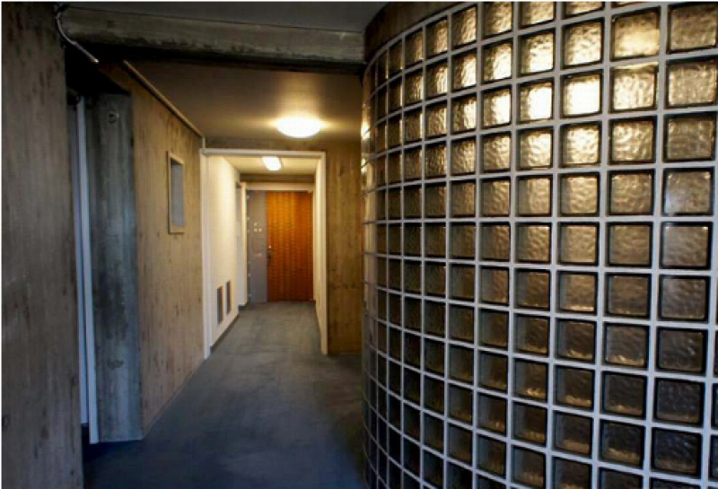 ガラスブロックが美しい共用部。上階まで吹き抜けているガラスブロックで覆われた円柱からは柔らかい光が放たれ、マンション全体になつかしさに似た温もりを与得ています。各所にちりばめられたこだわりやゆとりのある階段など、無機質な外観とは対照的に内部は職人さんの手の行き届いた暖かさが伝わってきます。