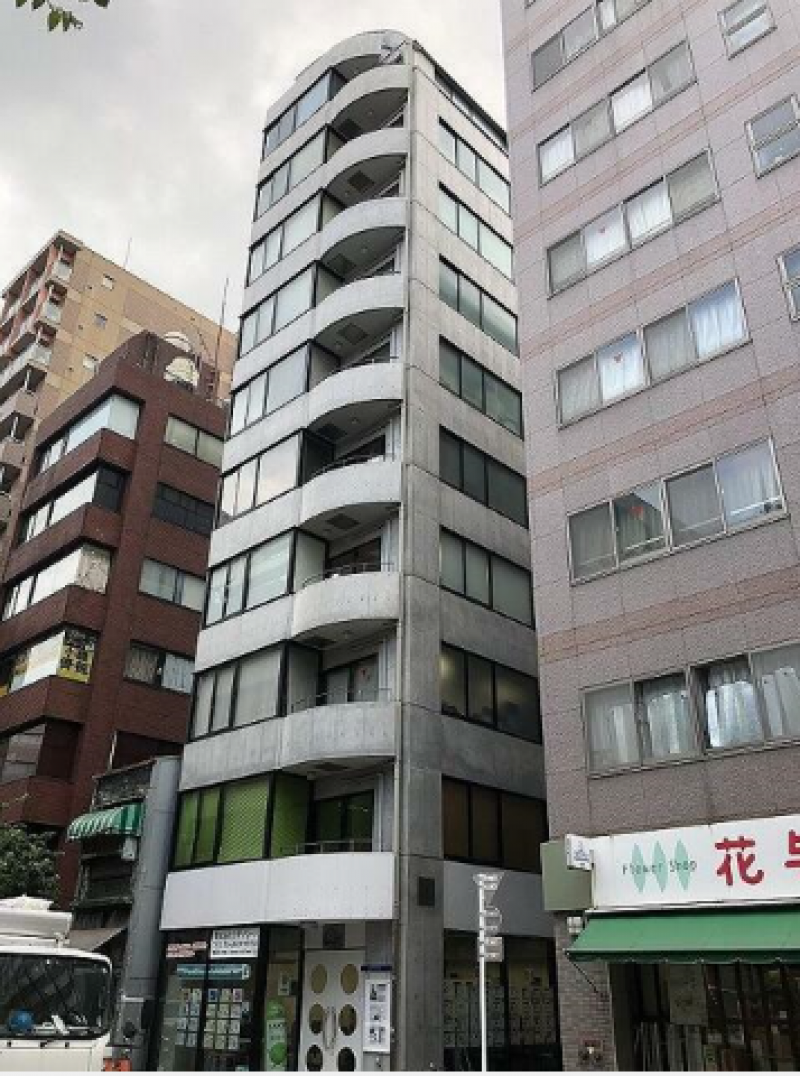 打ちっ放しの壁と規則的に並ぶ窓ガラスがビジネスライクなシャープさを演出する外観。弧を描くバルコニーがスタイリッシュさを添えます。