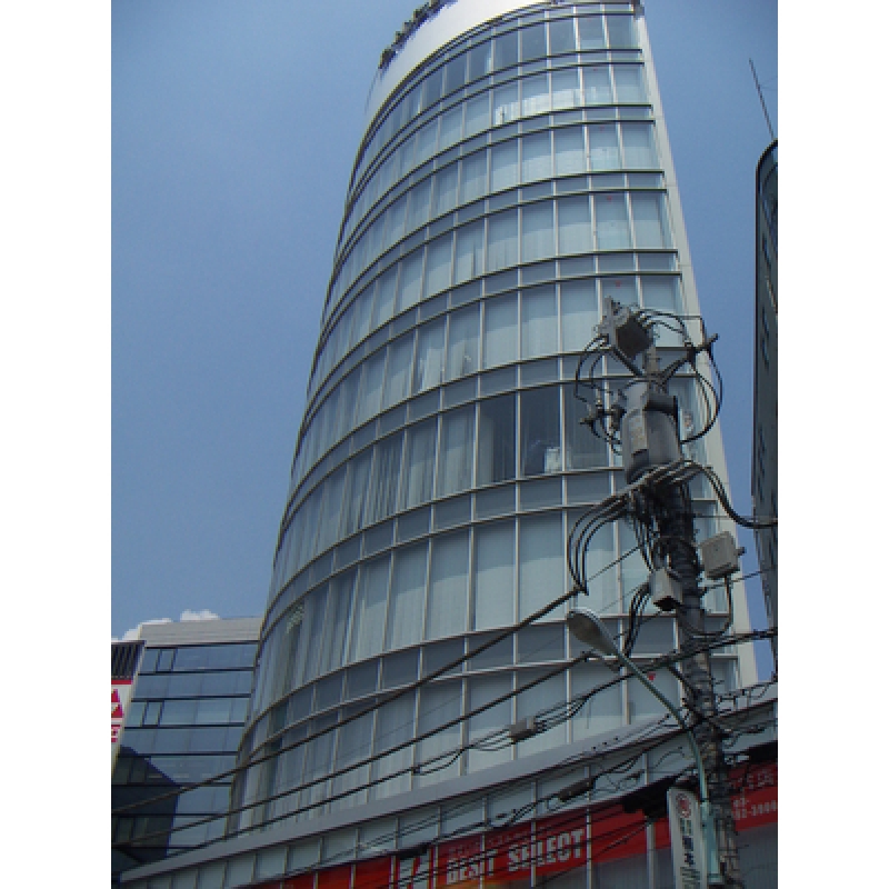 圧倒的な存在感を示すガラスウォールと、半円形のデザインが一際目を引く建物。渋谷のオフィスビルならではのスタイリッシュさを放ちます。