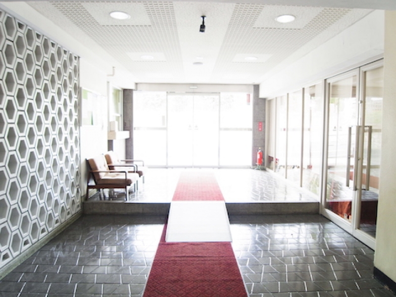グレーを基調とした落ち着いた雰囲気の外壁にブルーのタイルと植栽の緑が映える、どこか優しい気持ちになれる外観。ガラス扉から光が差し込み、明るく開放感のあるエントランスホールが、どこかノスタルジックな顔で迎えてくれます。
